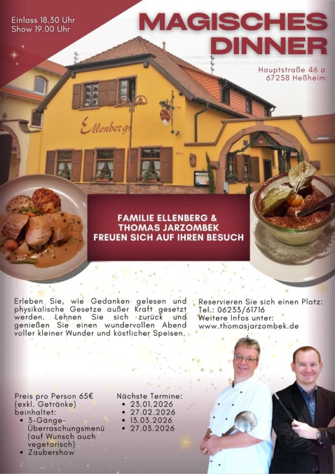Die Familie Ellenberg präsentiert zusammen mit Zauberkünstler Thomas Jarzombek im Restaurant "Ellenbergs" ein „MAGISCHES DINNER“. An diesem Abend wird Ihnen ein köstliches 3-Gänge-Menü, gepaart mit feinster Zauberkunst zwischen den Gängen, serviert. Erleben Sie, wie Gedanken gelesen und physikalische Gesetze außer Kraft gesetzt werden. Lehnen sie sich zurück und genießen Sie einen wundervollen Abend voller kleiner Wunder und köstlicher Speisen. Auf Ihr kommen freuen sich das „Ellenbergs Team“ und Thomas Jarzombek. Reservieren Sie schon heute Ihren Platz beim Magischen Dinner.